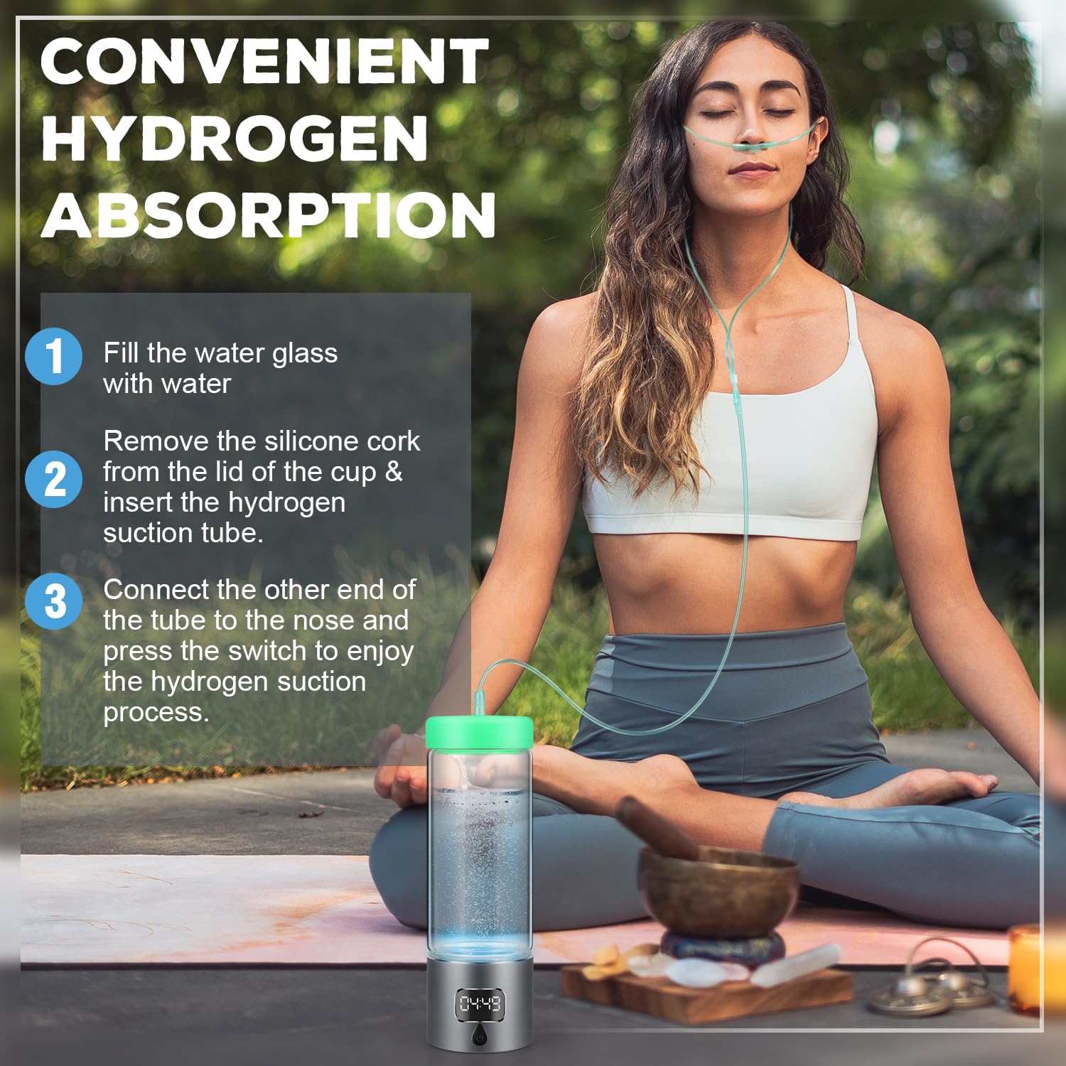 - Stylish Design and Food Grade Material:The hydro water bottle is made of food-grade borosilicate glass with a stable, non-slip silicone pad on the base for safe placement. The lid is tightly sealed with thick sealing strips to maintain hydrogen concentration. It is also equipped with a suction hose, so you can drink hydrogen-rich water as well as breathe freely to further enhance your health habits and reap the full health benefits.